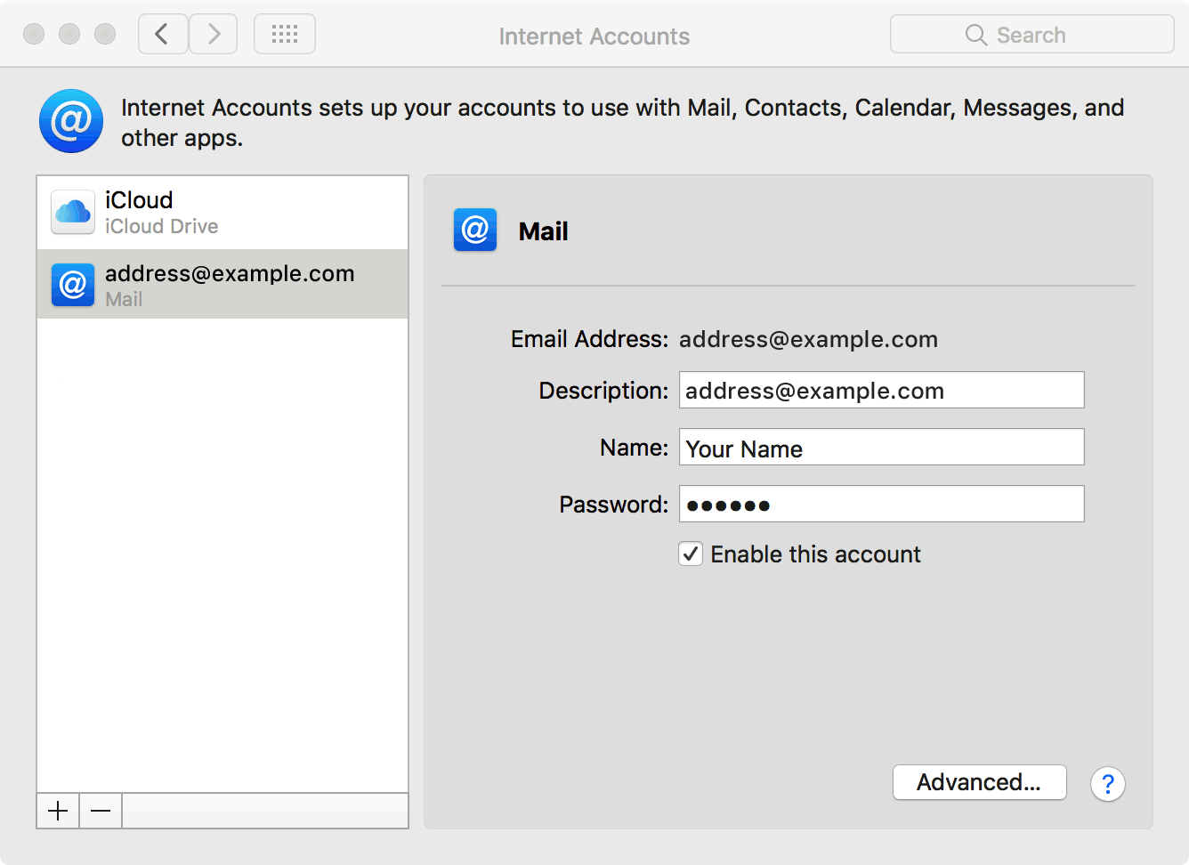 Click the Mail menu at the top of the screen and choose Accounts. This will open a window that looks like this: