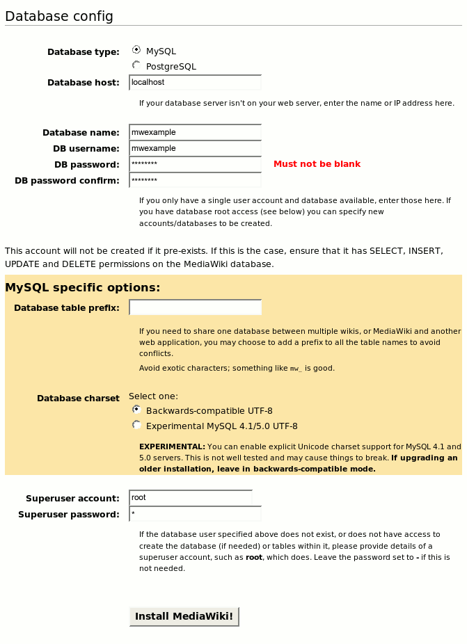 Enter mwexample as the username and database name, then enter the password you choose when creating the database.