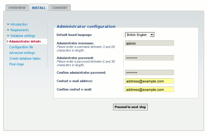 - Administrator username: (the phpBB3 username you wish to use; many people use "admin", but it can be anything)